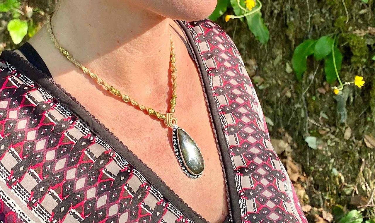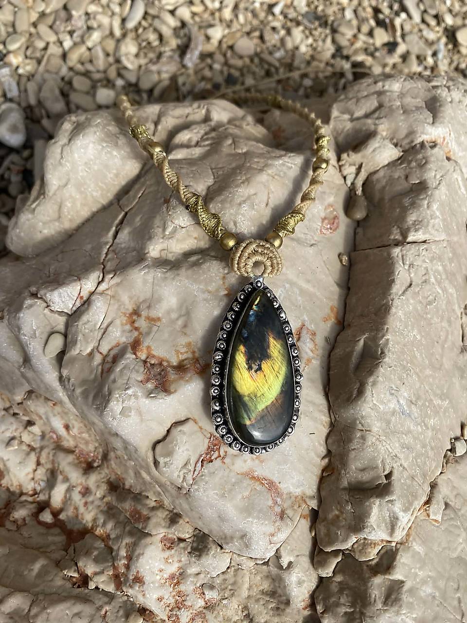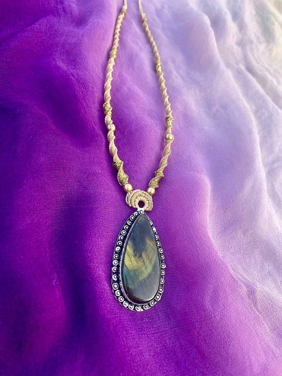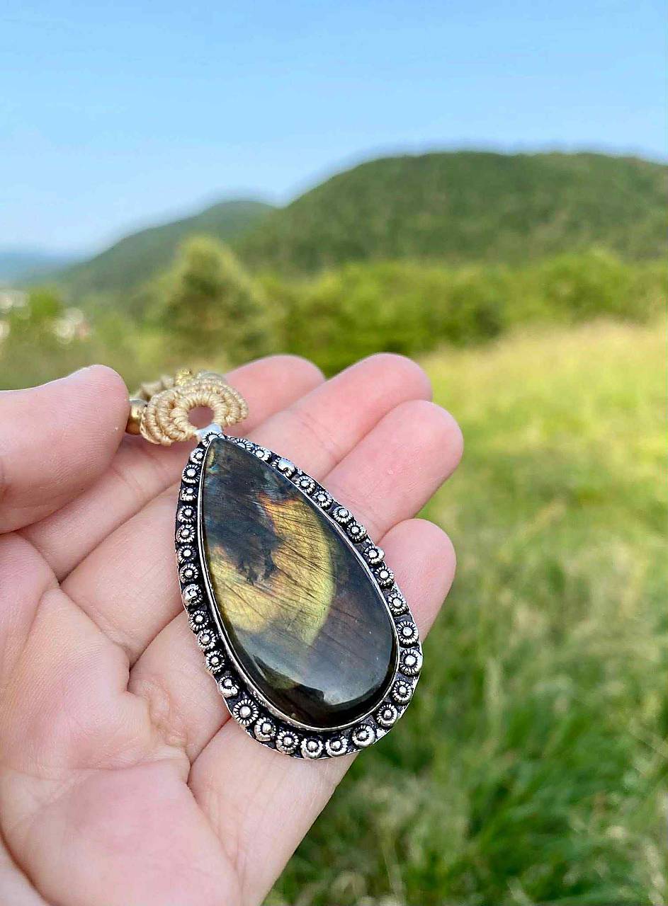 pomáha nám otvoriť sa a vnímať vnútornú krásu ľudí a vecí, vrátane seba samých. Má schopnosť ochraňovať našu auru pred nežiadúcimi energiami a udržiavať ju čistú. Môže byť nápomocný pri depresii ,znižovaní stresu a obáv, posilňovaní imunitného systému, pri stuhnutej šiji, pri bolestiach a napätí chrbtice... Náhrdelník uzlíkovaný technikou makramé s Labradoritom v striebre