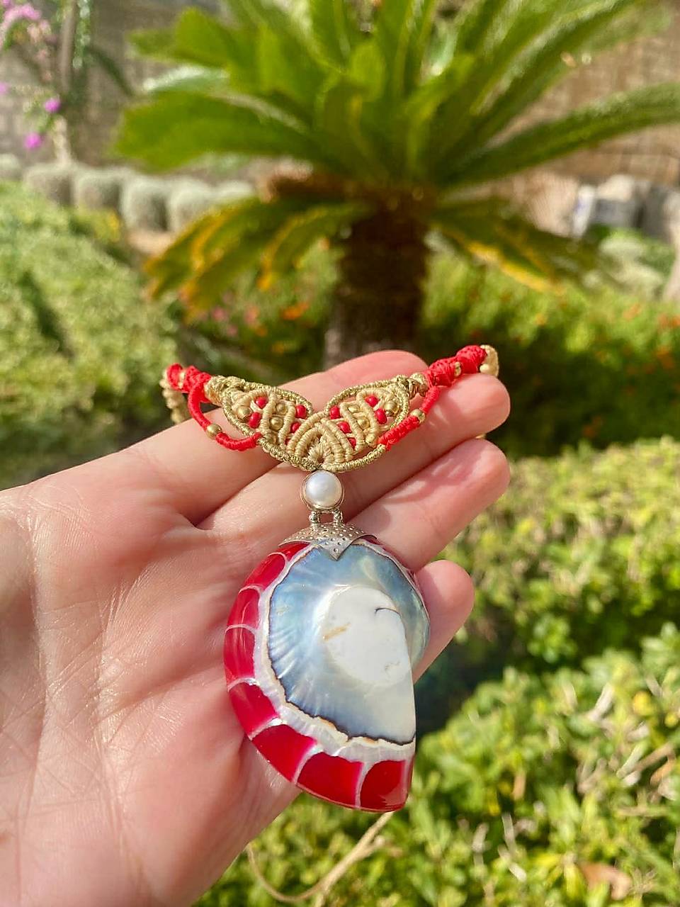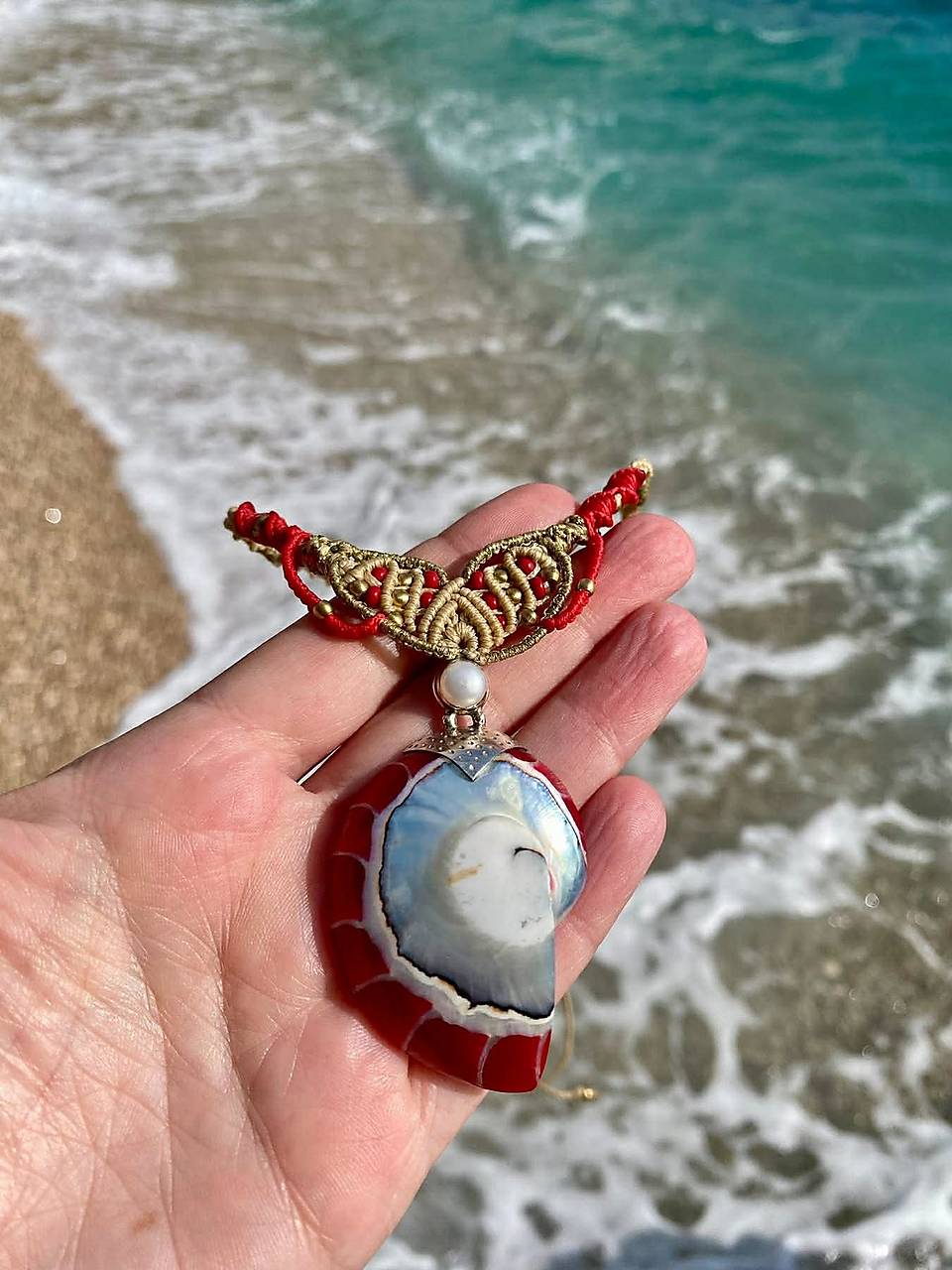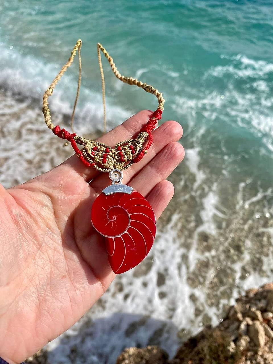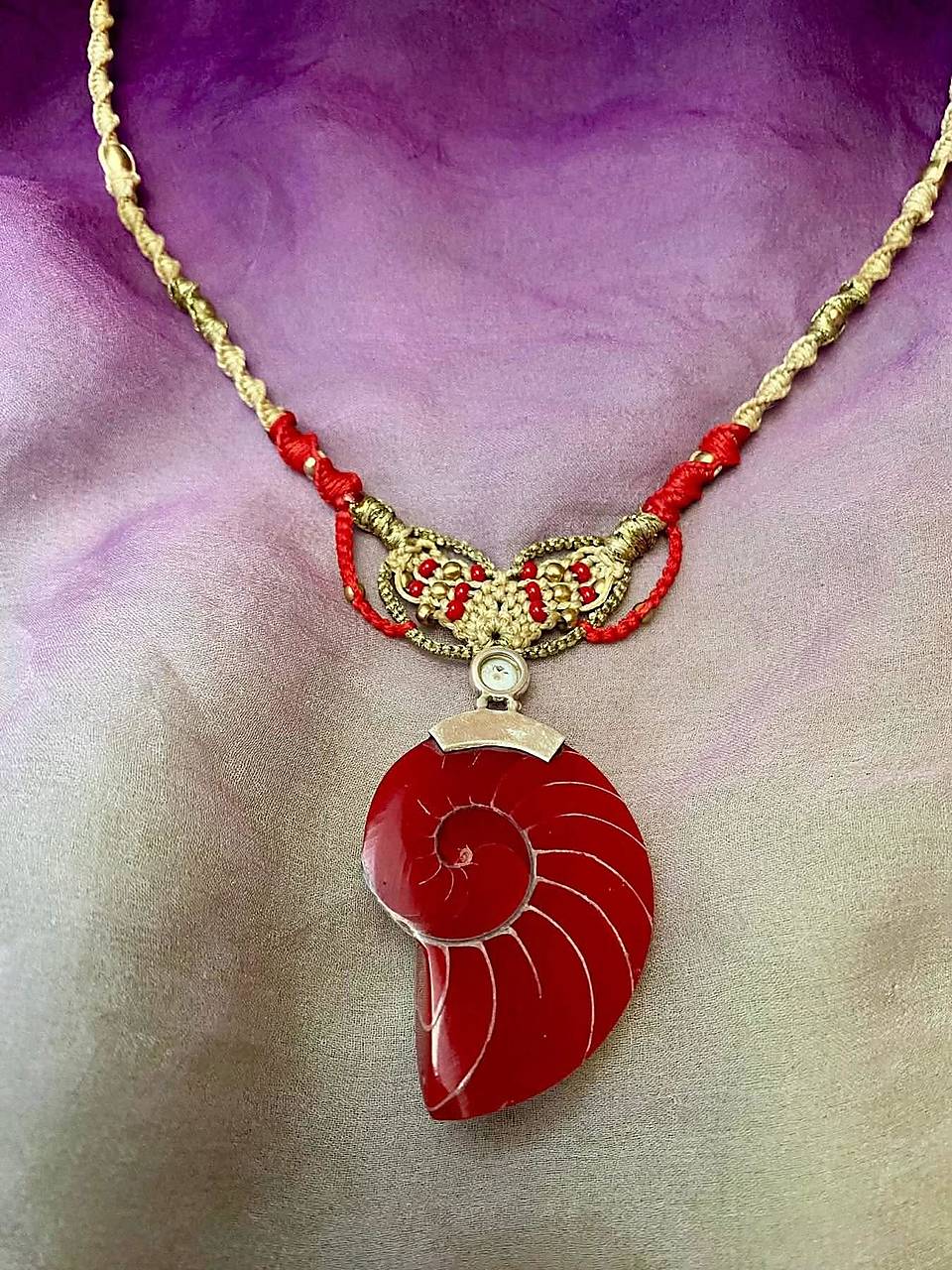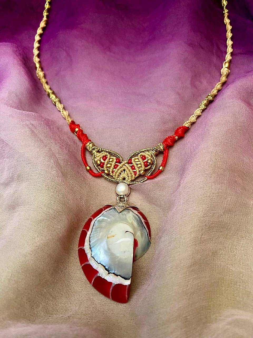 Náhrdelník s mušľou Nautilius a s Perlou v striebre, spevnený červenou živicou