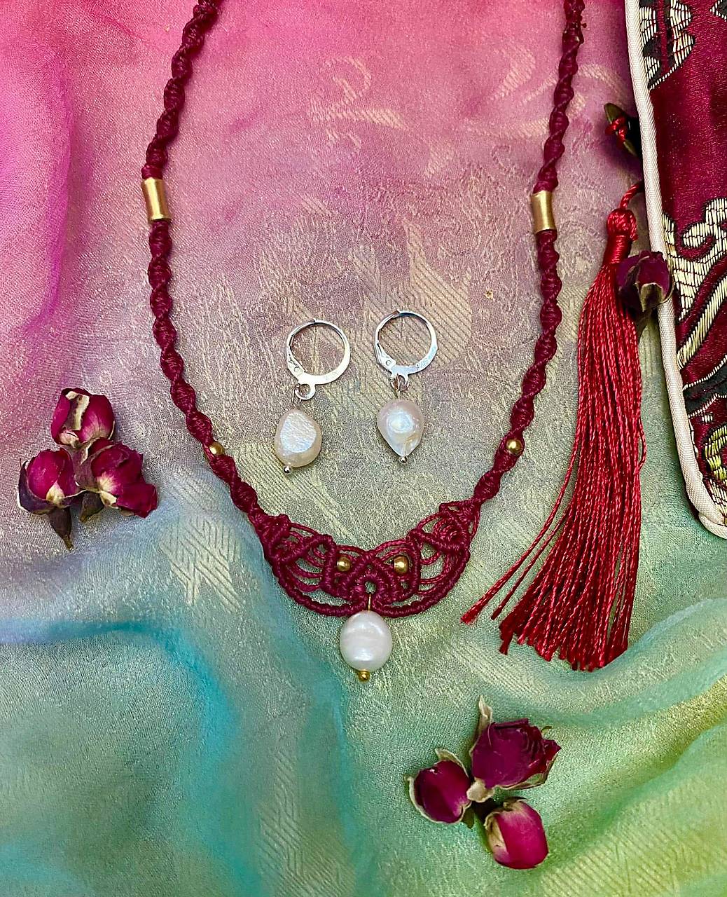 Náhrdelník makramé a náušnice s Perlami, háčiky v striebre